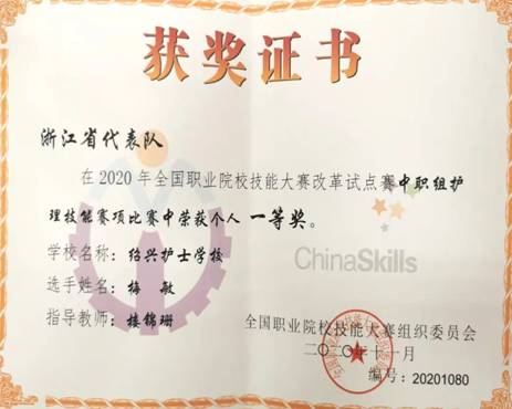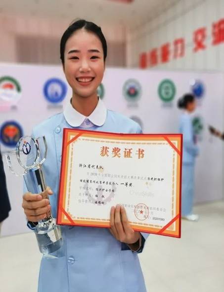 此次征战,梅敏同学以省赛第一名成绩代表浙江省参加国赛,历时近半年的全封闭理论知识、操作技能、心理素质训练,让她在赛场上沉着冷静,发挥稳定,以让专家老师们赞扬"几乎完美的操作"夺得金牌。