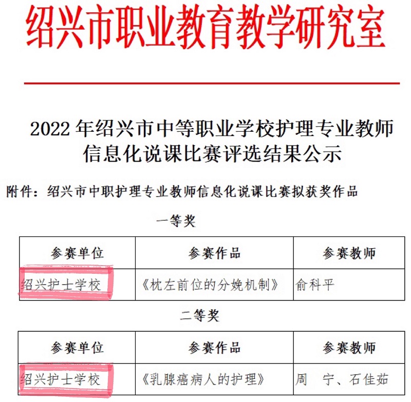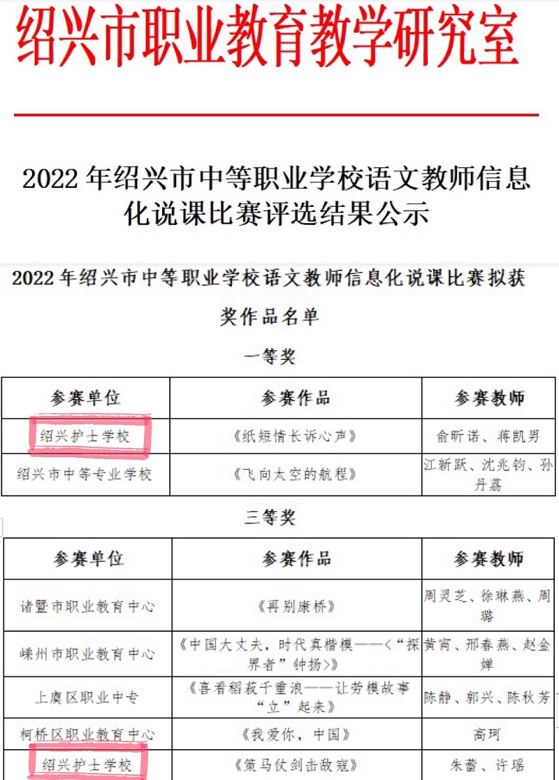 近日,学校喜报频传。在刚刚落幕的绍兴市2022年中职教师信息化说课比赛中,护理组俞科平老师获一等奖,周宁、石佳茹老师获二等奖,宋佳颖老师获三等奖;语文组俞昕诺、蒋凯男团队获市赛一等奖,朱蕾、许瑶团队获三等奖;数学组宋金琦老师获三等奖;英语组尹璐茜老师获三等奖;劳动教育组崔欢、赵占瑜和程月霞老师获三等奖。其中,俞科平、周宁和俞昕诺三位老师获得省赛资格!