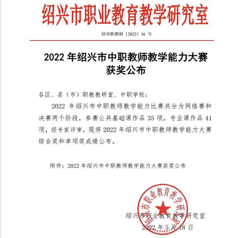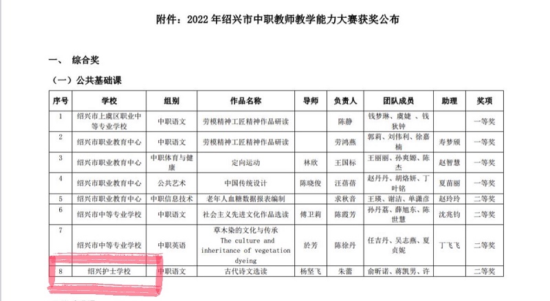 近日,绍兴市职业教育教学研究室公布了2022年绍兴市中职教师教学能力比赛获奖名单,比赛分为网络赛和决赛两个阶段。betway3支教师团队从全市35个公共基础和41个专业课参赛团队中脱颖而出,全部荣获奖项,取得市级综合奖一等奖1项、二等奖1项、三等奖1项的佳绩。其中,护理组周桂兰、王梦雨、王嘉蔓、周?团队(导师:寿菲)获得市级一等奖,并取得绍兴市医药卫生类唯一一张省赛入场券;中职语文组朱蕾、俞昕诺、蒋凯男、许瑶团队(导师:杨坚飞)获得市级二等奖,这也是betway语文组团队首次参加该项赛事;医学组赵占瑜、卓胜男、黄志新、吴钰敏团队(导师:周溢彪)获得市级三等奖,这支最年轻的团队已经初露锋芒。
