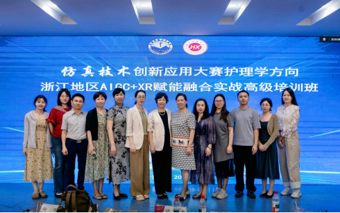 近日,仿真创新应用大赛护理学向浙江地区AIGC+XR赋能、融合实战高级培训在betway西汉姆联官网顺利召开,省内外十多家医院护理专家、十余家高校护理骨干教师、一家公司代表积极参会。本次会议聚焦人工智能生成内容(AIGC)与扩展现实(XR)技术在护理教育、临床培训及科研创新中的前沿应用,旨在推动技术融合,提升护理人才培养质量与专业实践水平。