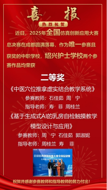 本届大赛由工业和信息化部人才交流中心主办,旨在推动数字仿真技术应用,服务国家产业发展。比赛伊始,betway领导高度重视,教研室全程指导,教师团队不懈努力,时刻紧扣大赛宗旨,将仿真技术与护理学教学及临床实践难题深度融合。《中医穴位推拿虚实结合教学系统》、《基于生成式AI的乳房自检触摸教学模型设计与应用》这两项作品分别聚焦于中医护理与外科护理仿真训练等领域,通过构建高仿真的虚拟场景与交互模型,有效提升了护理技能训练的精准性与应对复杂临床情况的能力,获得了评审专家对其实用性、创新性的高度认可。