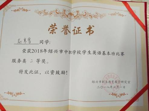 喜讯!6月1日下午,betway西汉姆联官网学生赵寒雪在2018年绍兴市中职学校学生英语基本功比赛中喜获二等奖,指导老师为betway英语教研组组长寿柳娣老师。